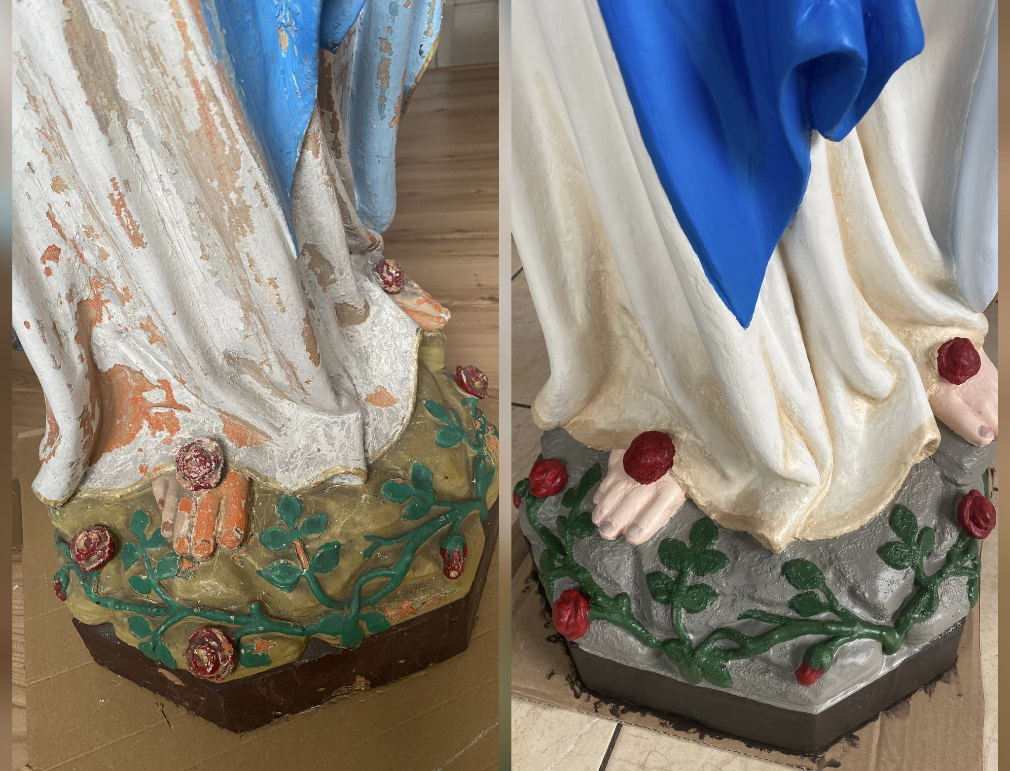 Odnawiamy figurki przeznaczone do domów, ale podejmujemy się również odnawiania figur kościelnych. Preferujemy przywiezienie figury do naszej pracowni. Jeśli jednak figura jest zbyt duża to dojeżdżamy do wybranego miejsca i prowadzimy renowację na miejscu.