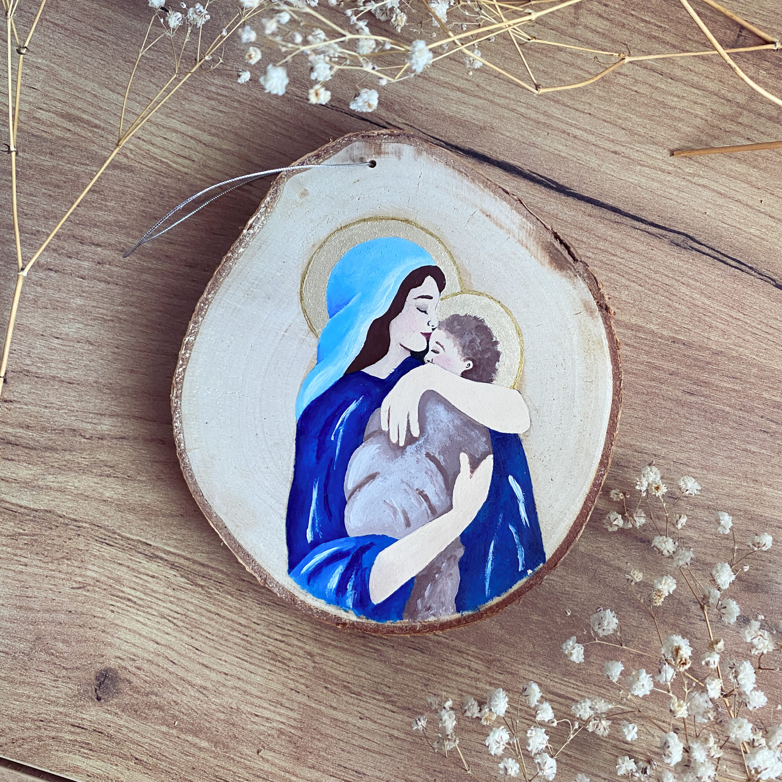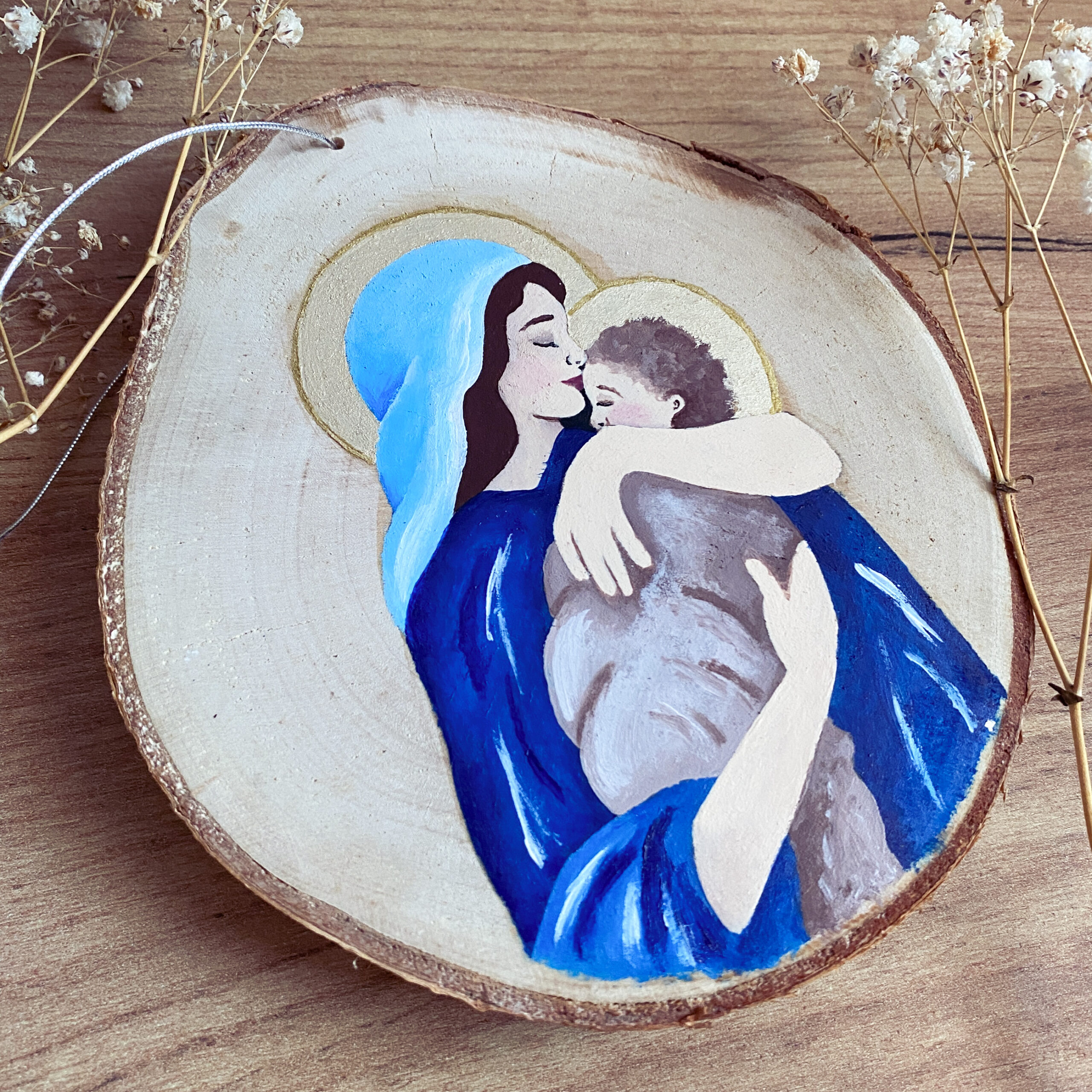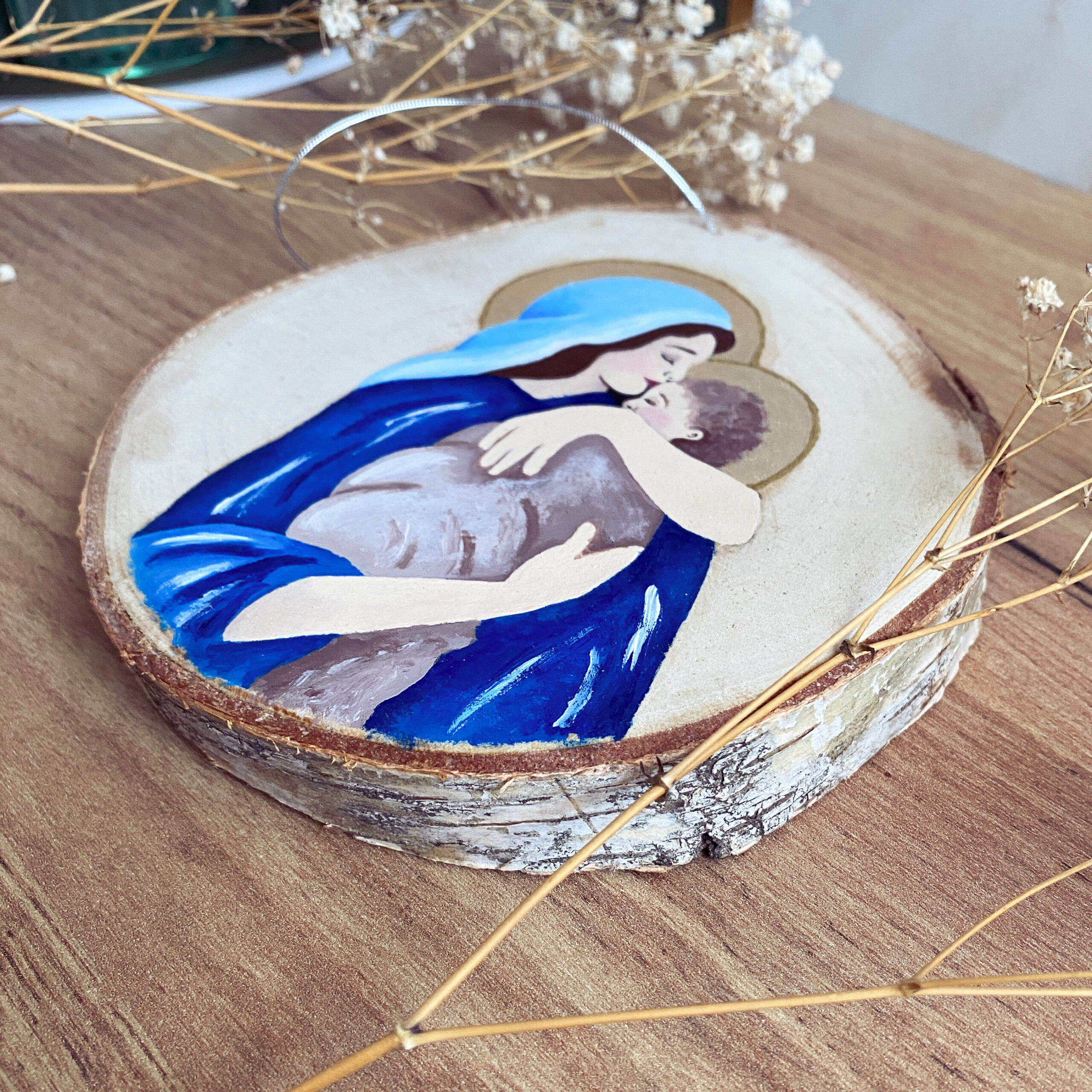 Ręcznie malowana zawieszka na drewnie – Maryja z Dzieciątkiem Jezus | Dekoracja religijna | Prezent chrześcijański