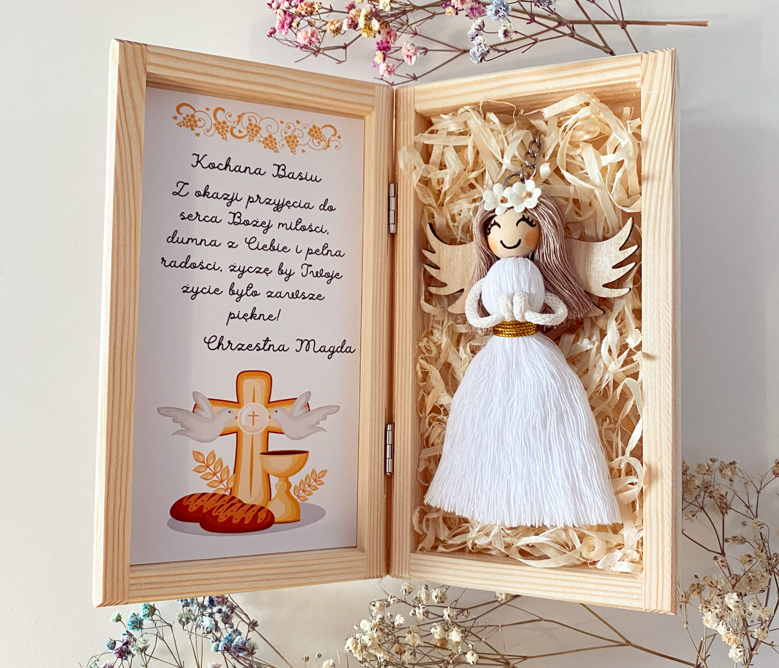 W sklepie Biały Kruk stworzyliśmy eleganckie, drewniane pudełko, które z kielichem mszalnym oraz satynową, białą kokardą tworzy na pierwszy rzut oka idealny prezent na Pierwszą Komunię Świętą. Wewnątrz znajduje się krótki tekst z piękną dedykacją oraz podpisem. Oczywiście to tylko nasza propozycja 🙂 W drugiej „komórce” znajdziemy wyjątkowego Aniołka, który jest również brelokiem. W tej ofercie Aniołek jest dziewczynką, jeśli jednak potrzebujesz Aniołka chłopaka – poszukaj w naszym sklepie takiej oferty!