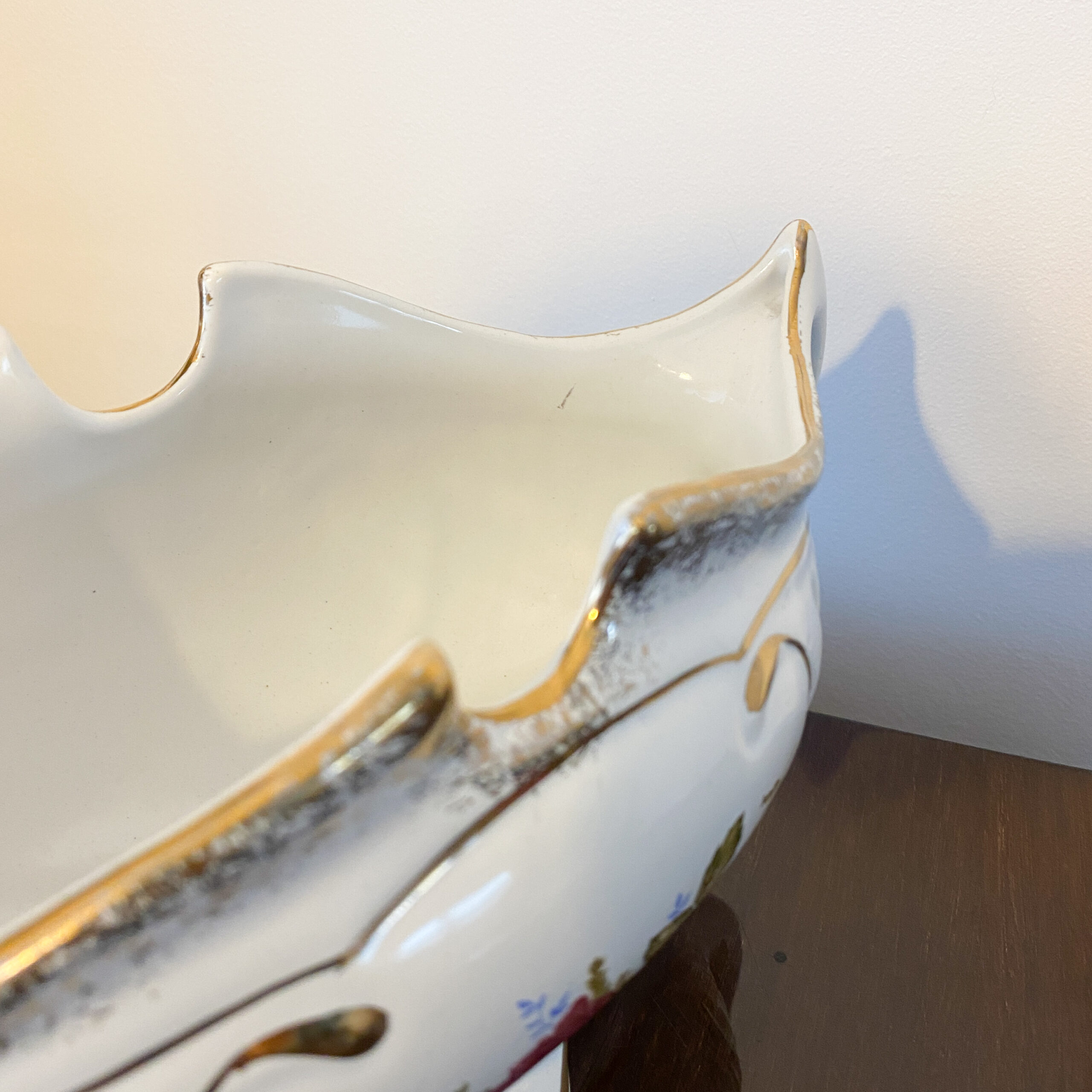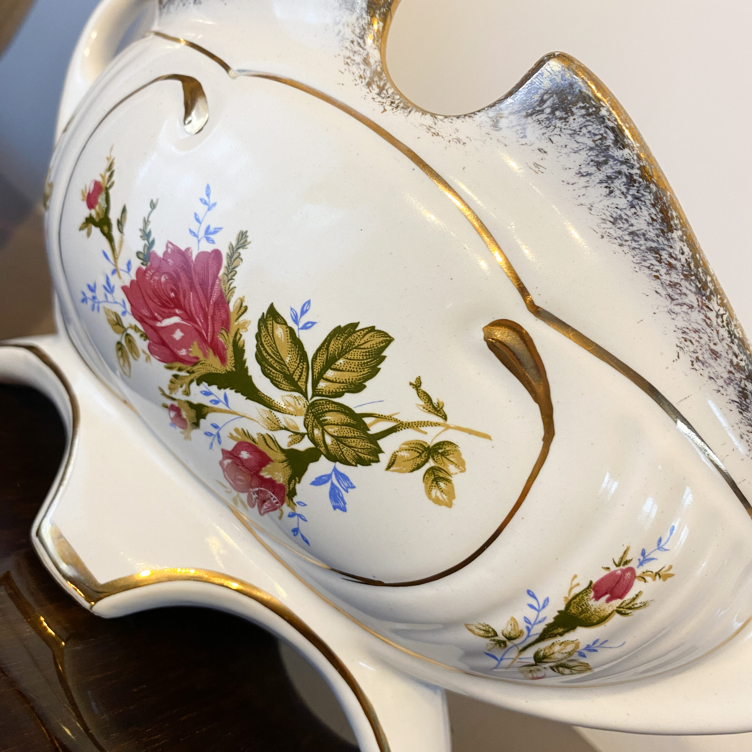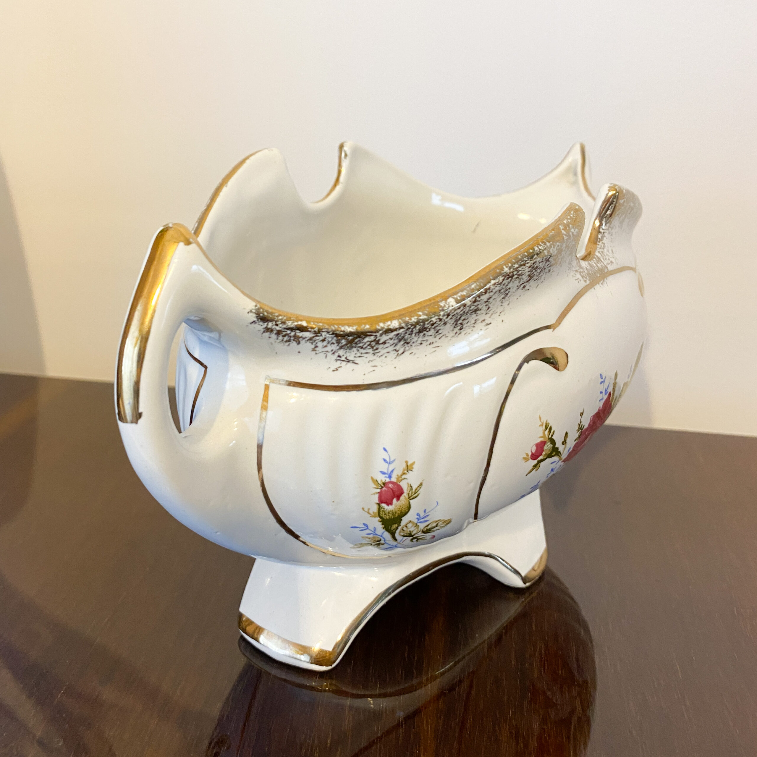 Powierzchnię zdobi subtelny, wielobarwny motyw kwiatowy – róże i drobne kwiaty w naturalistycznej kompozycji – uzupełniony złoceniami na krawędziach i detalach. Całość utrzymana jest w ciepłej, kremowej tonacji charakterystycznej dla dawnej porcelany użytkowo-dekoracyjnej.