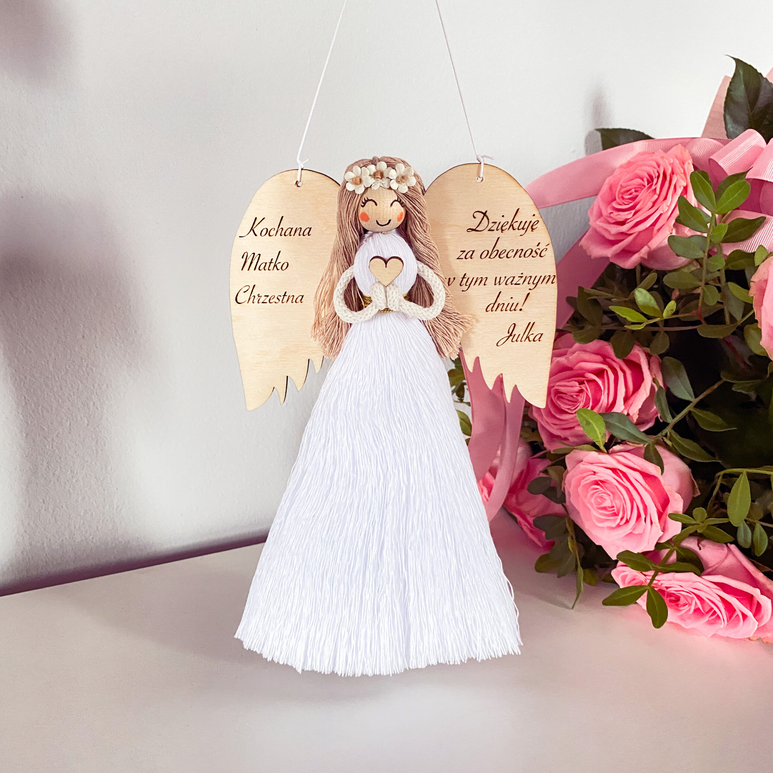 Nasz Anioł Makrama, które polecamy jako podziękowanie dla Matki Chrzestnej jest całkowicie personalizowany! Możesz wybierać pośród wielu kolorów sukienek a nawet włosów! Chcemy wychodzić Wam na przeciw i wiemy, że każdy ma inny gust. Dzięki temu nie musisz się martwić czy dany aniołek się spodoba – możesz wybrać jej lub jego ulubione kolory, z których nasz produkt będzie stworzony, a gwarantujemy, że na pewno Twój prezent będzie na długo zapamiętany! Ponadto na skrzydle możesz wybrać swój własny grawer, dzięki któremu jeszcze bardziej podkreślisz wagę okazji! Podarujmy sobie wzajemnie prezenty, które pozostaną na długo w pamięci.