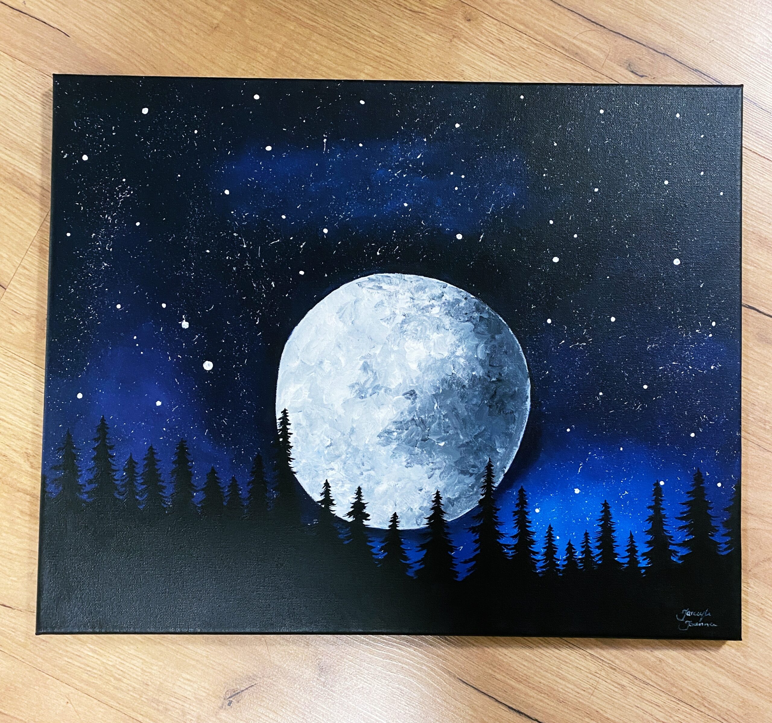 Obraz akrylowy Księżycowa Noc namalowany został w 2022 roku. Malowany profesjonalnymi farbami akrylowymi firmy Renesans, zabezpieczony werniksem akrylowym.