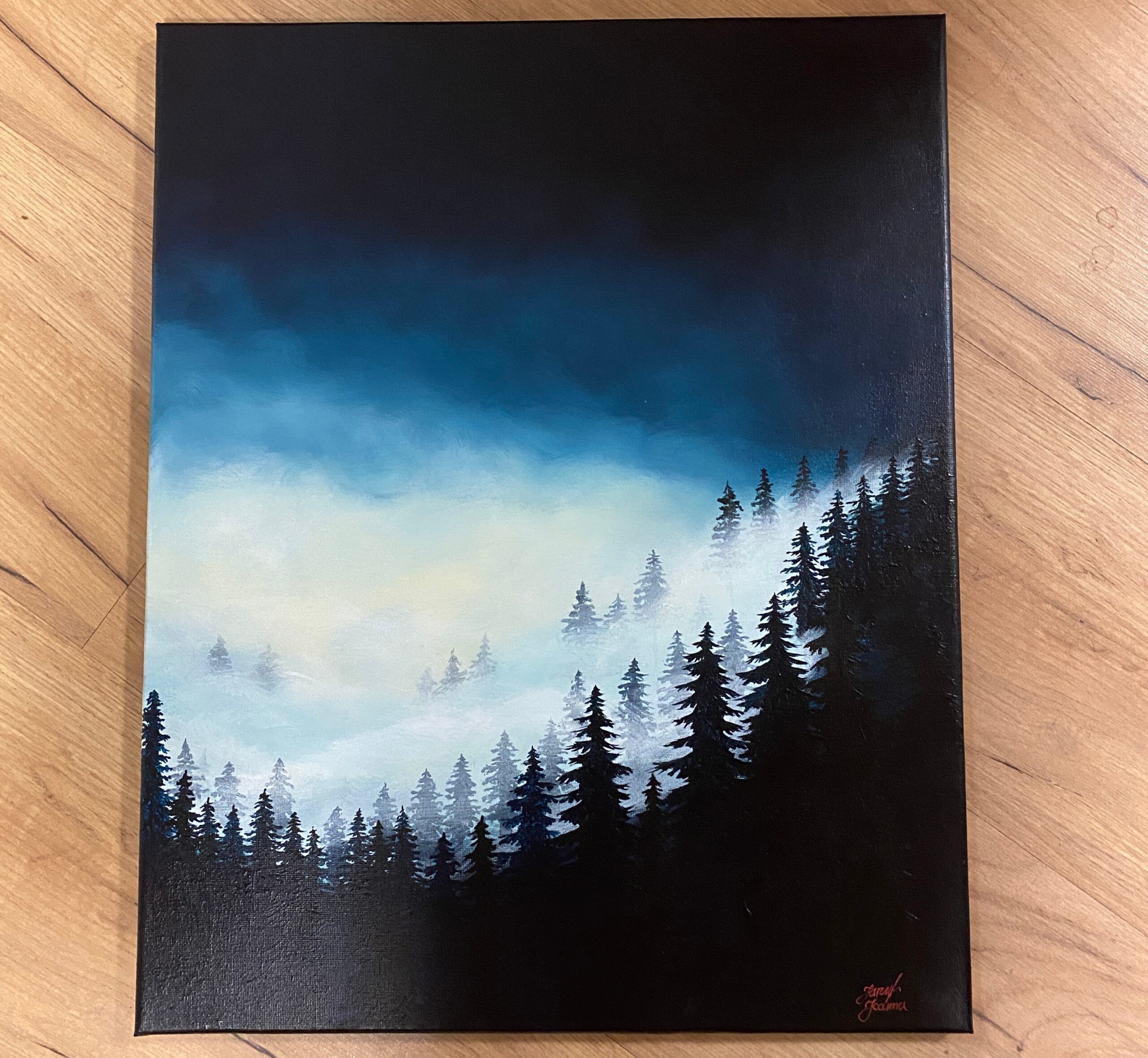 Obraz akrylowy Mglisty poranek namalowany został w 2022 roku. Malowany profesjonalnymi farbami akrylowymi firmy Renesans, zabezpieczony werniksem akrylowym.