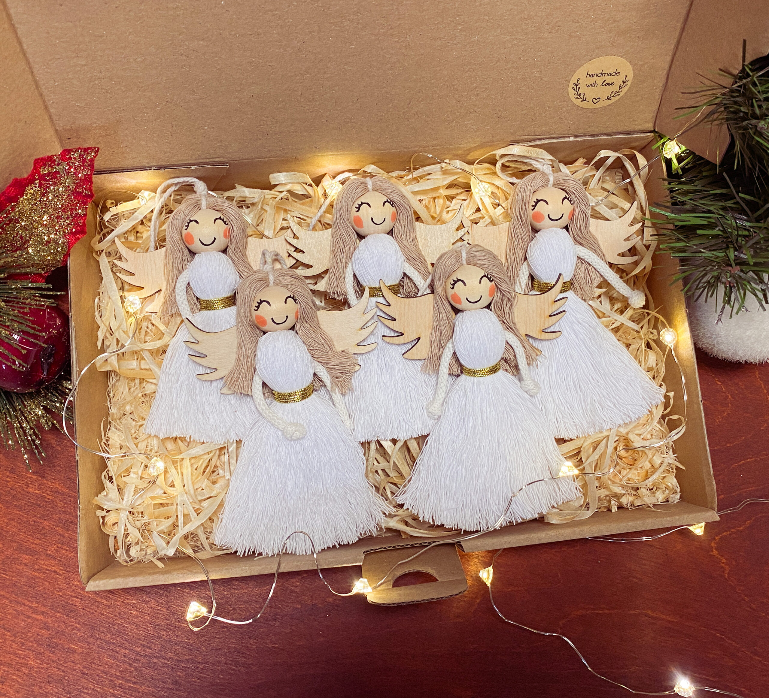 Aniołki Makrama na Choinkę z drewnianymi skrzydełkami – Świąteczny zestaw zawieszek