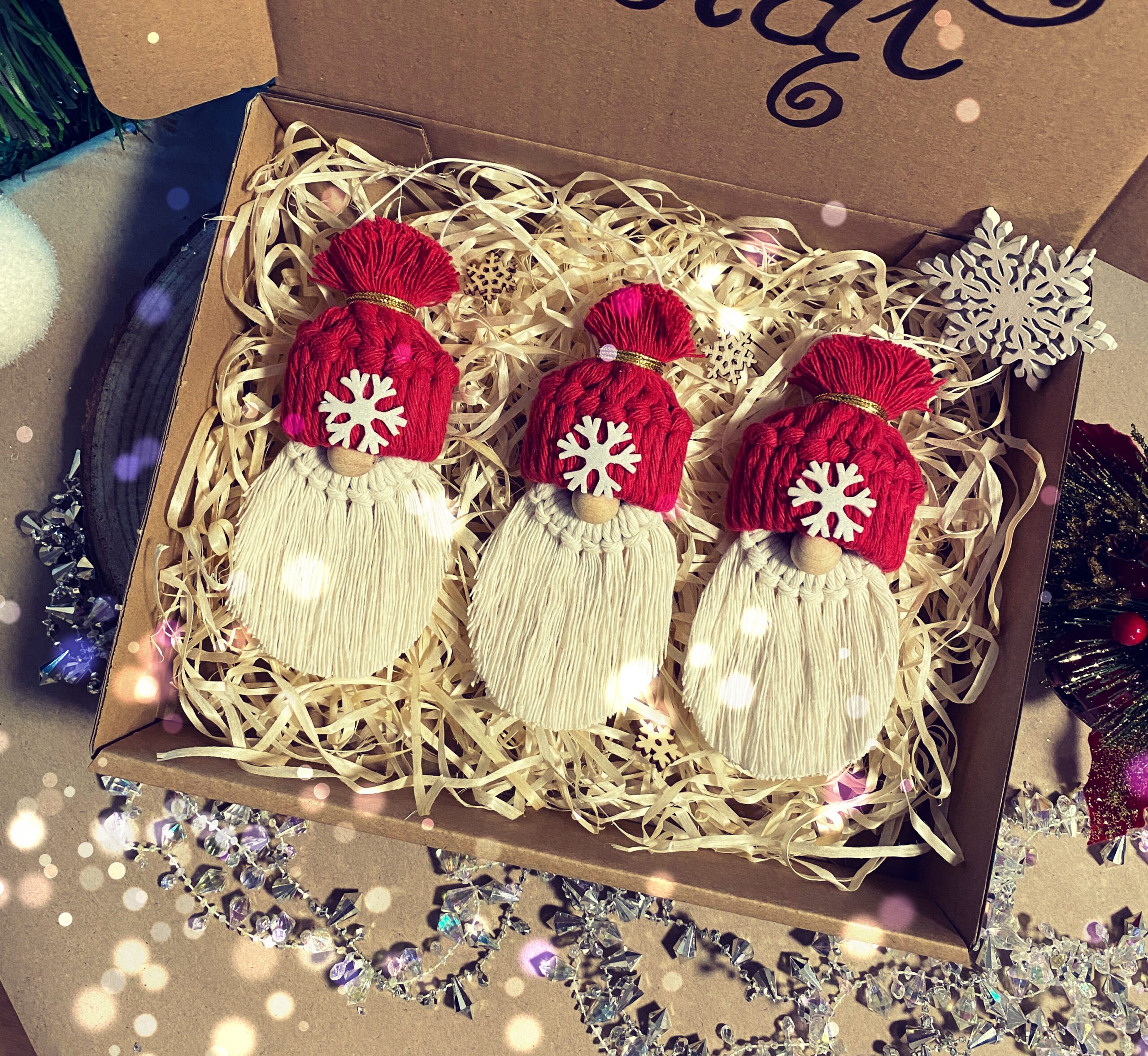 Świąteczny zestaw zawiera trzy Mikołaje oraz pudełko prezentowe. Ozdoby wykonane techniką makramy ze sznurka bawełnianego najwyższej jakości. Wybierz swój ulubiony kolor czapeczki 😉