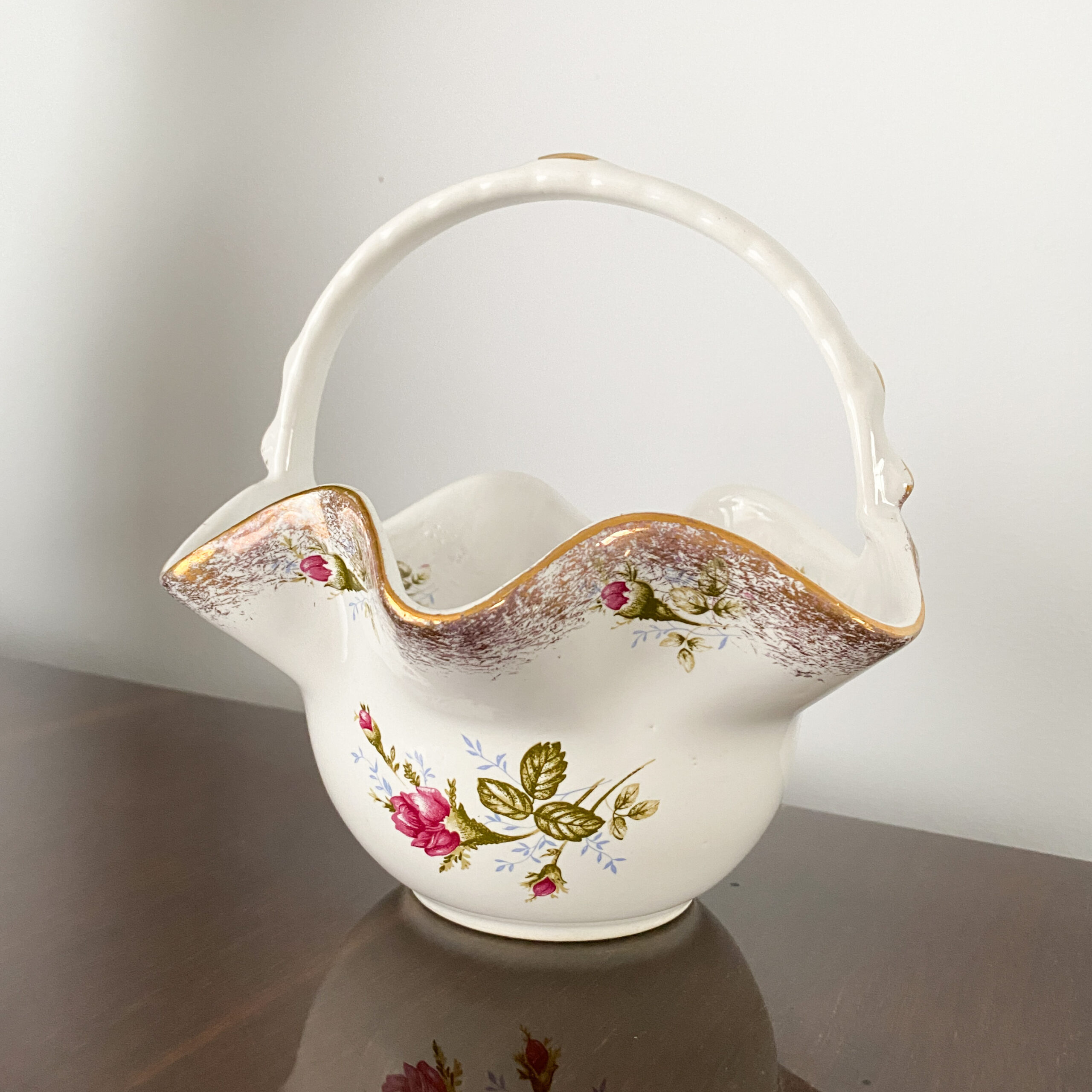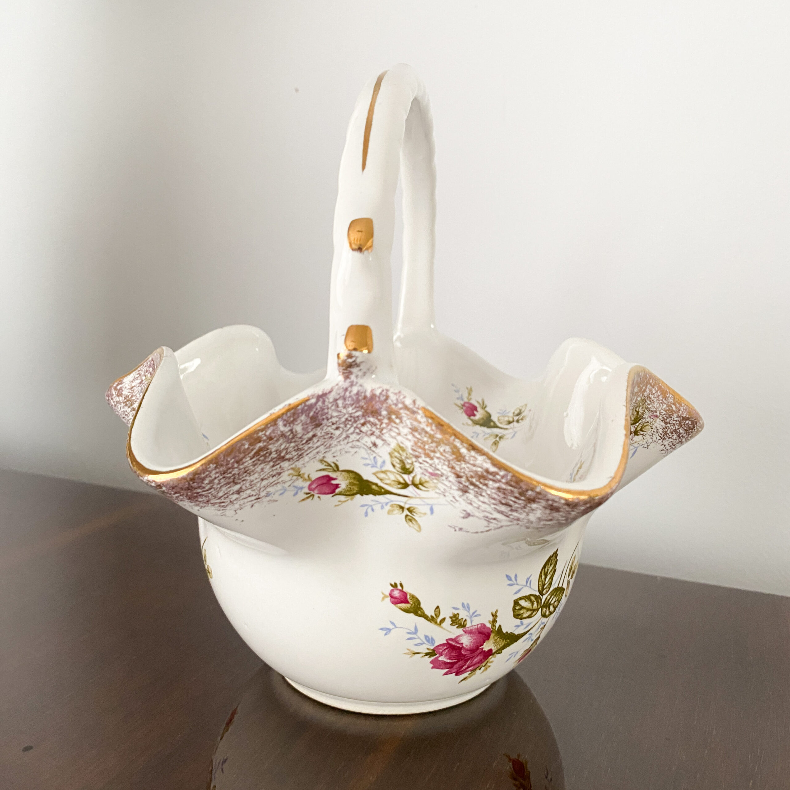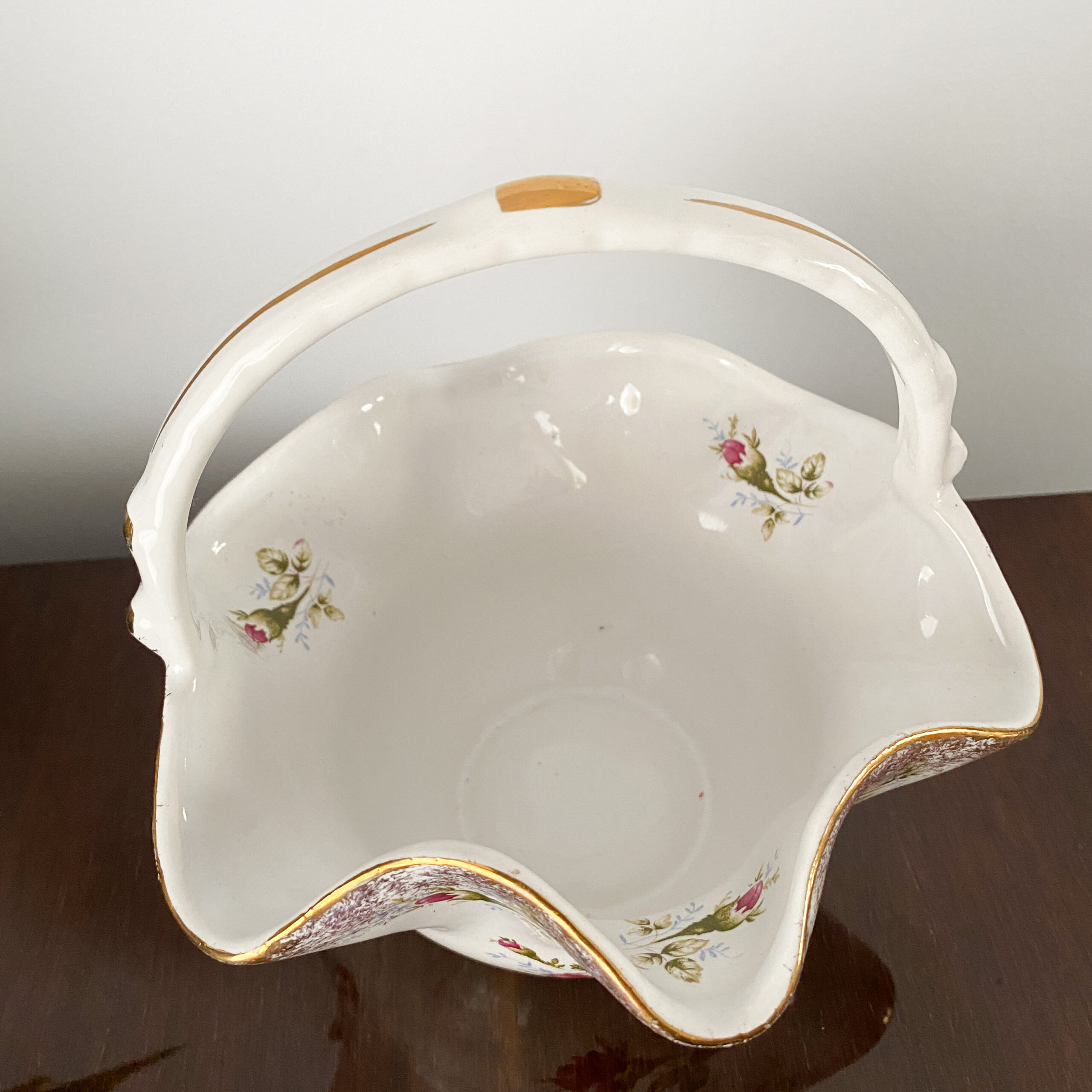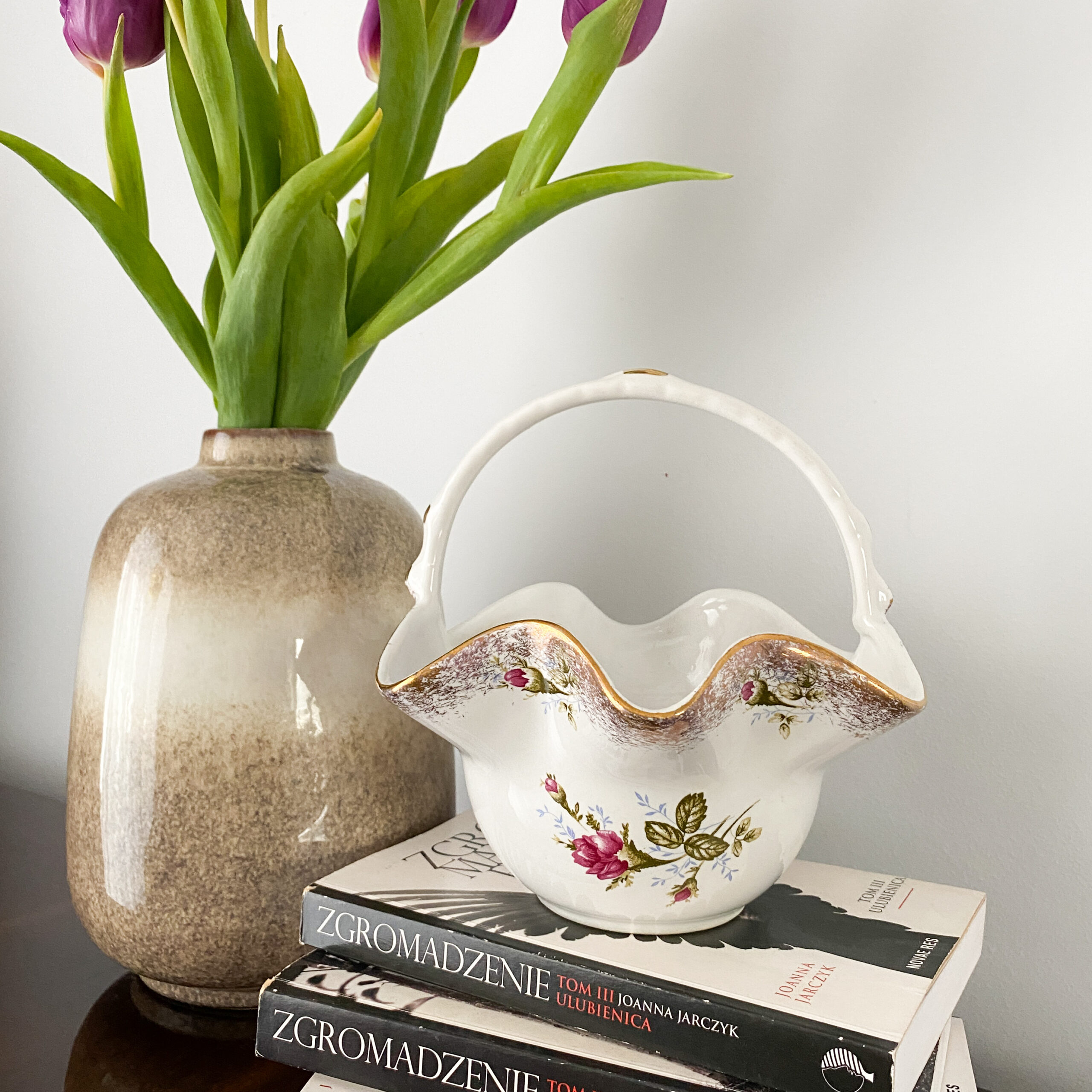 Wyjątkowy porcelanowy koszyczek marki Chodzież, wykonany z wysokiej jakości polskiej porcelany i zachowany w idealnym stanie. Forma z dekoracyjnym uchwytem oraz falowanym rantem nadaje mu elegancki, klasyczny charakter. Koszyczek zdobiony jest subtelnym motywem róż w pastelowych odcieniach różu i zieleni, uzupełnionym delikatnymi akcentami błękitu. Całość dopełnia finezyjne złocenie na krawędziach, podkreślające szlachetność wyrobu. Koszyczek posiada dekoracyjne otwory drenażowe – element oryginalnego projektu, a nie wada produktu.