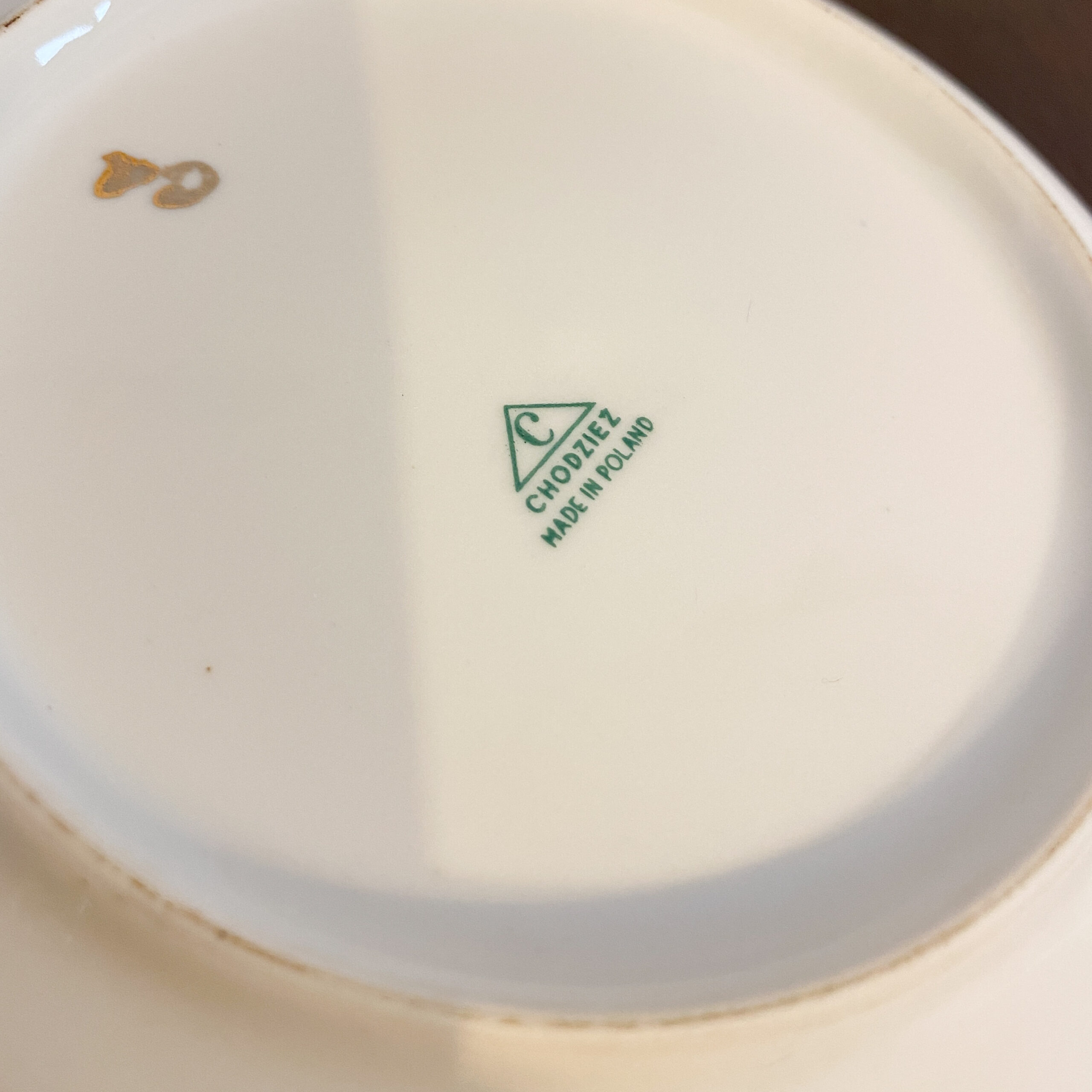 Powierzchnię talerzyka zdobi subtelny motyw kwiatowy w stonowanej kolorystyce, charakterystyczny dla wyrobów Chodzieży z okresu powojennego. Całość uzupełniają delikatne złocenia na krawędzi, dodające lekkości i elegancji. Na spodzie znajduje się zielona sygnatura, potwierdzająca pochodzenie i czas powstania wyrobu.